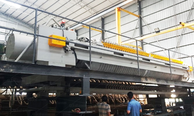 明流直排管不能設(shè)置角孔,濾液直接由排液面一個(gè)出口孔一個(gè)集成孔一個(gè)明流管排出。整個(gè)設(shè)備只有明流排液,直排管是否需要根據(jù)實(shí)際需要安裝閥門,選煤時(shí)一般不安裝閥門。此外,在某些場合使用時(shí),不安裝直排管,而是將集成孔直接向下穿透濾板,形成明流口,濾液的接收采用集液翻板,如一些金屬礦山和化工行業(yè)的一些壓濾機(jī)。